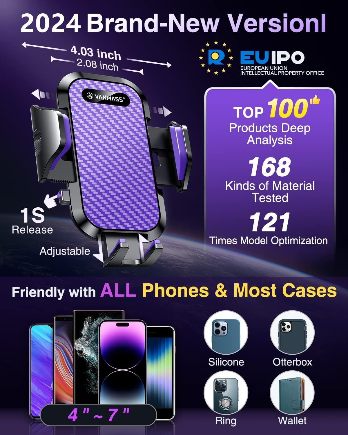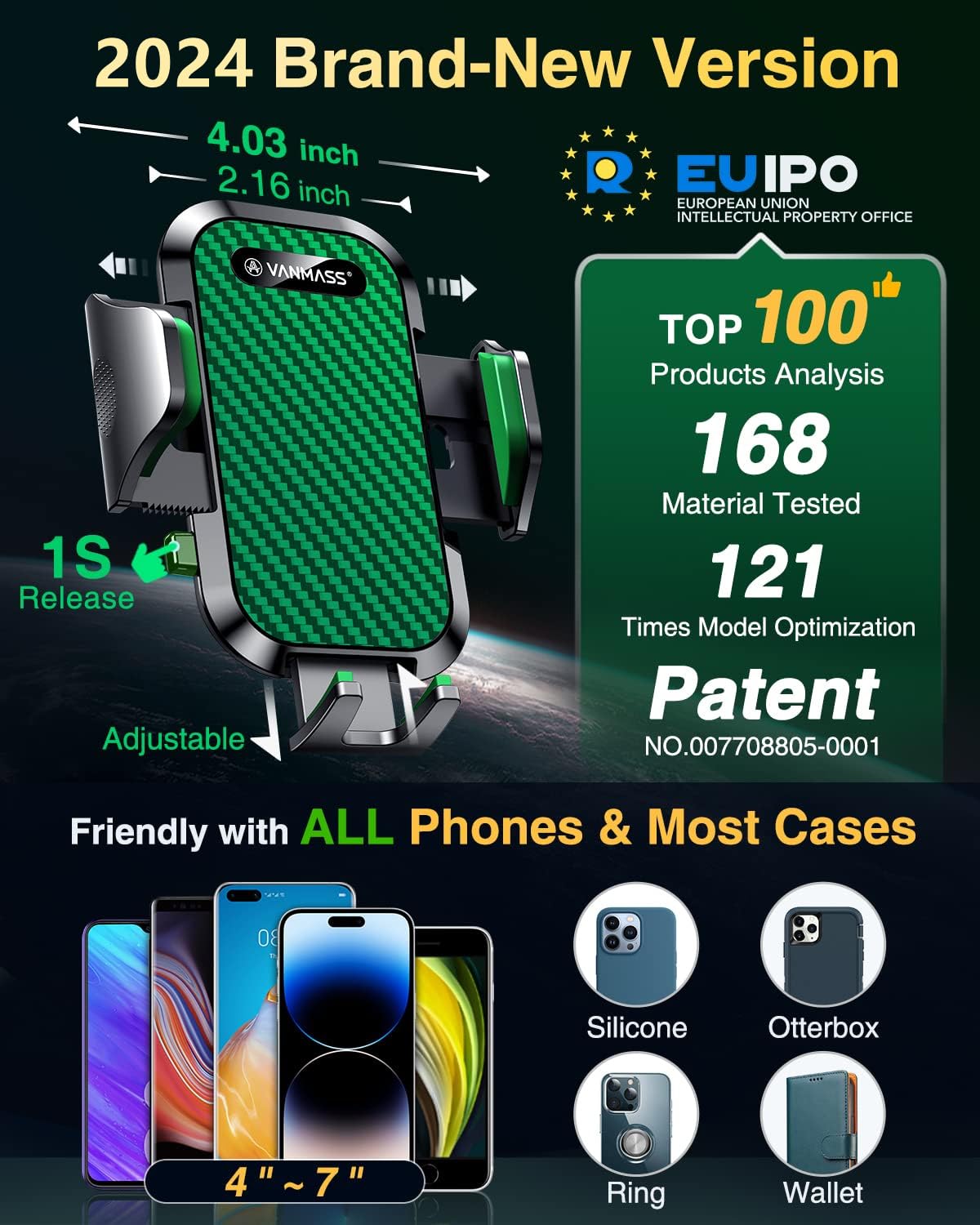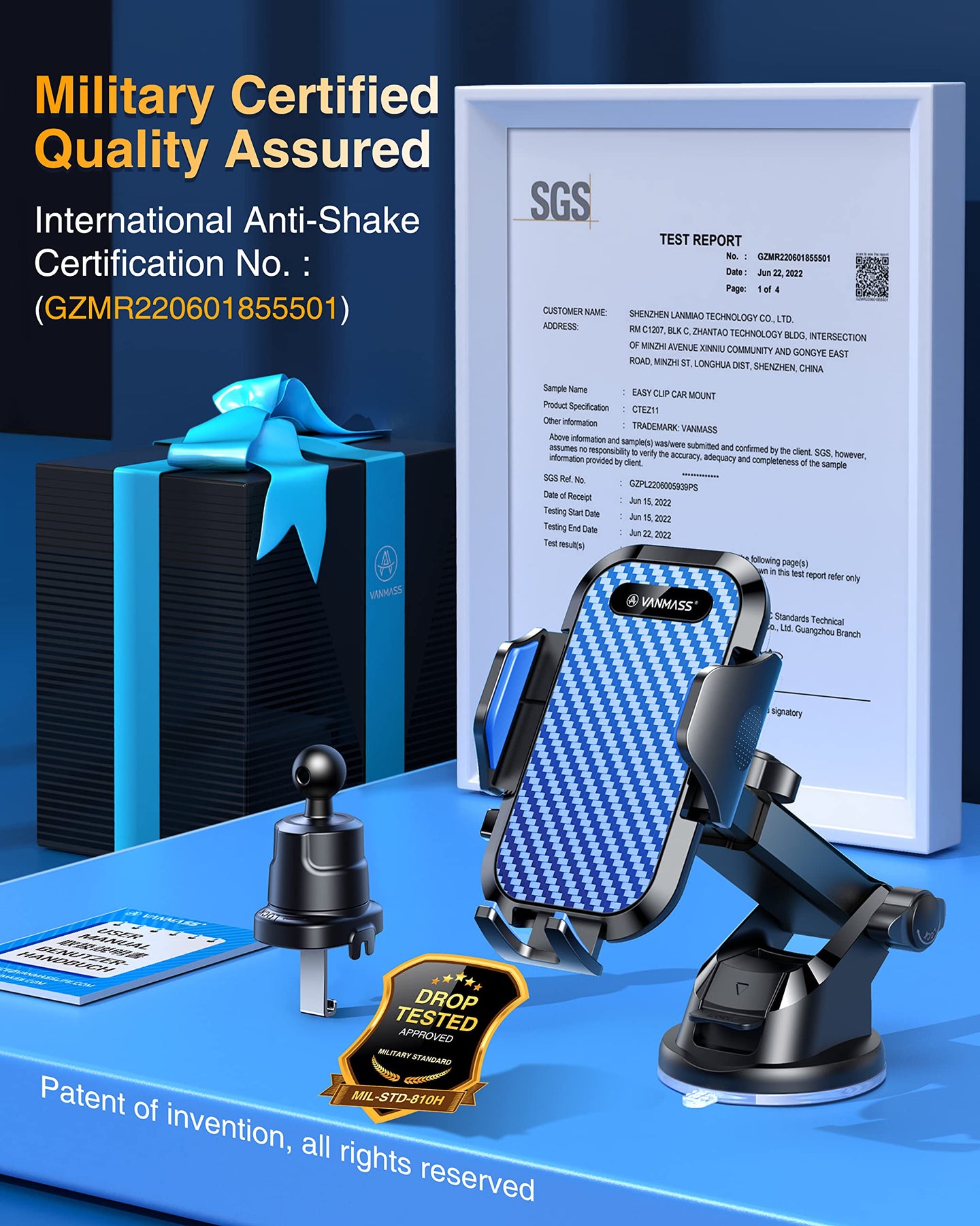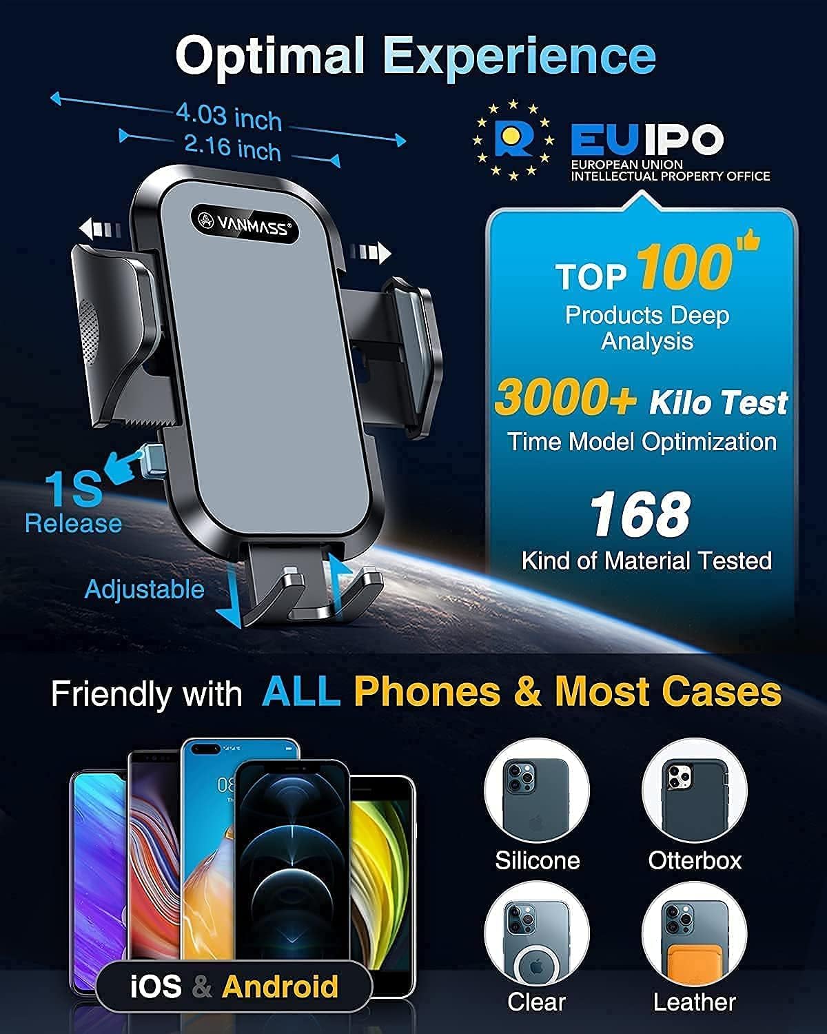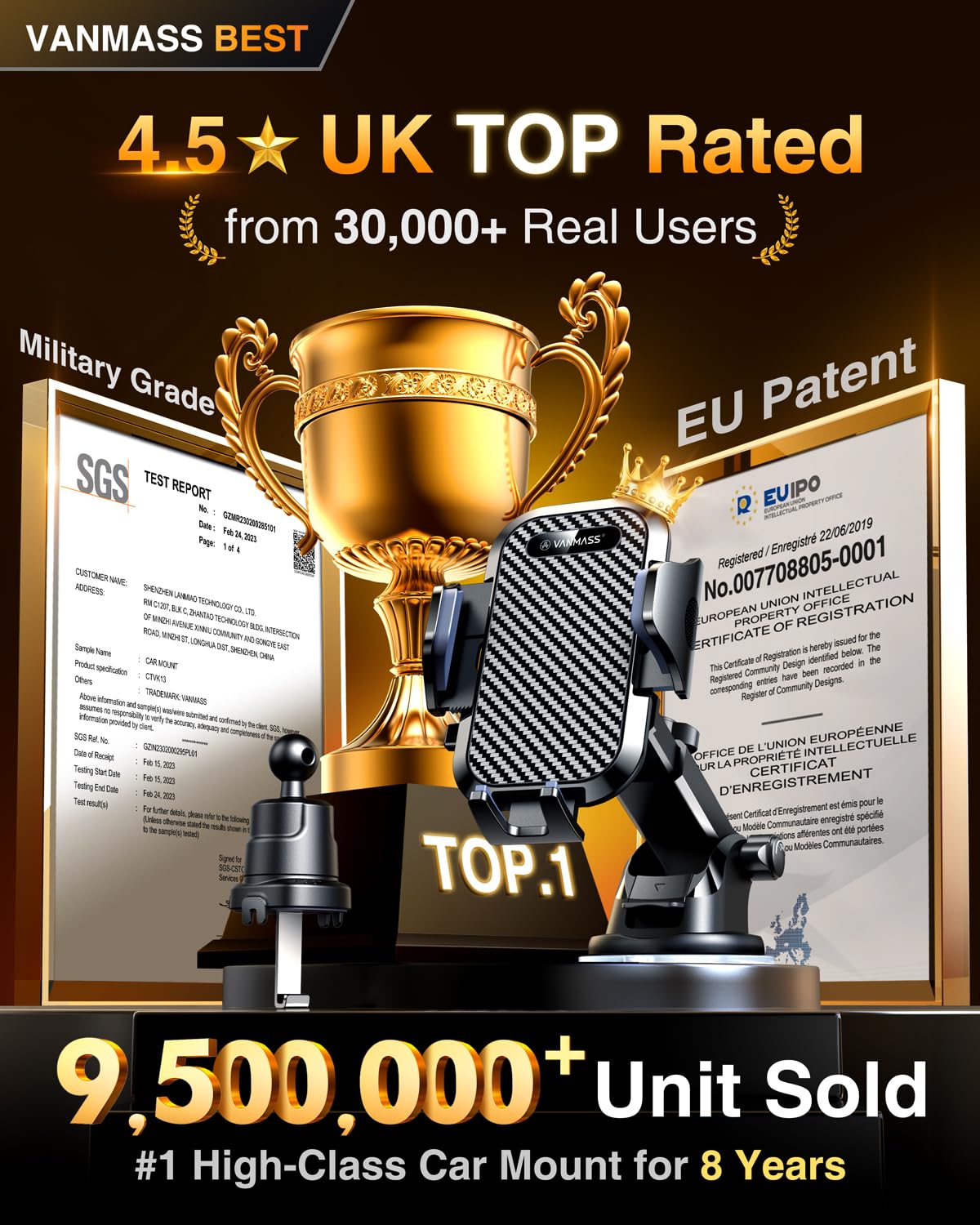 • 【2025 Best Ultimate Model - Military Grade Certified】Rated 4.5 from 30K+ real users, this is UK top rated high-grade car phone holder! Over past 8 years, VANMASS have listened to the voices of millions of users, rigorously tested to Military-Grade standards (stability, durability, security).💪Finally, we overcome all weaknesses to design this most popular high-quality car mount. This item obtained military-grade shockproof certification No.GZMR220601855501 and EU patent No.007708805-0001
